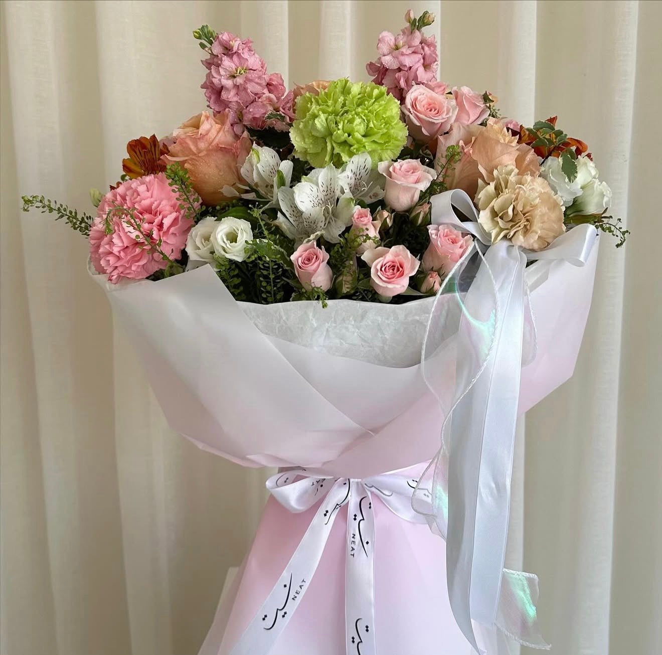 A soft symphony of romance and grace — this bouquet captures timeless beauty in every bloom. Delicate pink and peach roses, paired with lush greenery and touches of white, come together in perfect harmony. Wrapped in soft pastel tones and finished with satin ribbons, it’s an exquisite gesture of love, celebration, or pure appreciation.