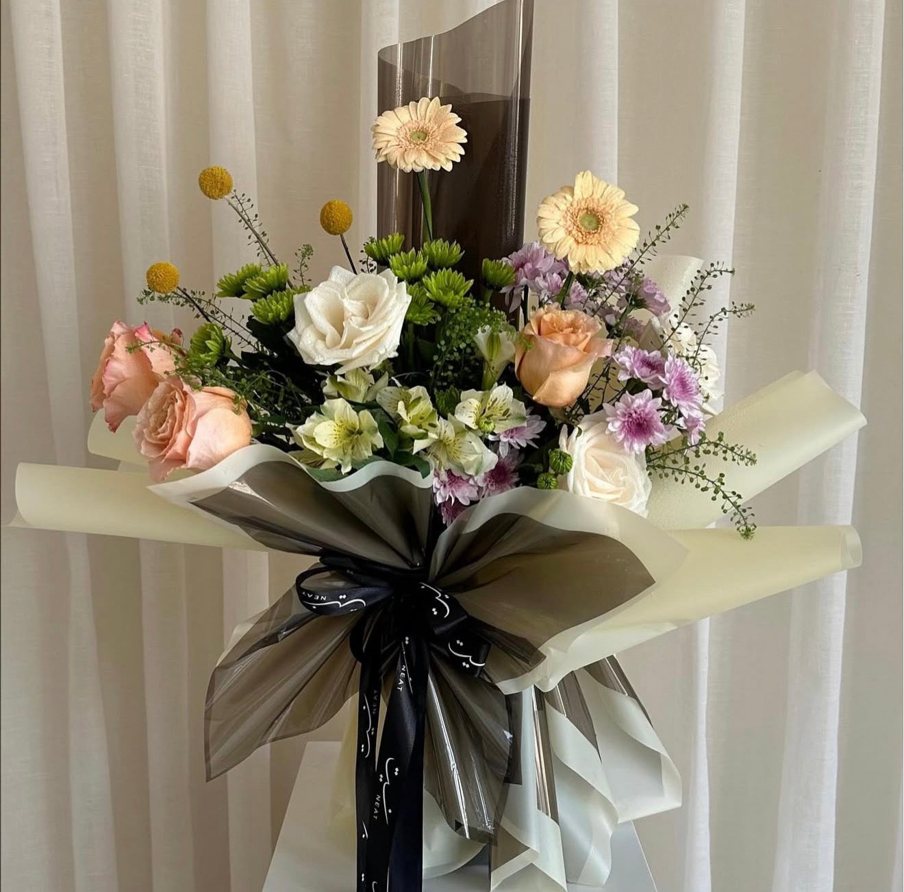 A soft melody of elegance — Golden Whisper captures the beauty of calm sophistication. Featuring pastel roses, creamy whites, and touches of golden yellow, this bouquet radiates warmth and balance. Wrapped in refined layers of ivory and smoke-toned paper, tied with a sleek black ribbon, it embodies understated luxury — perfect for thoughtful gifting or timeless celebrations.