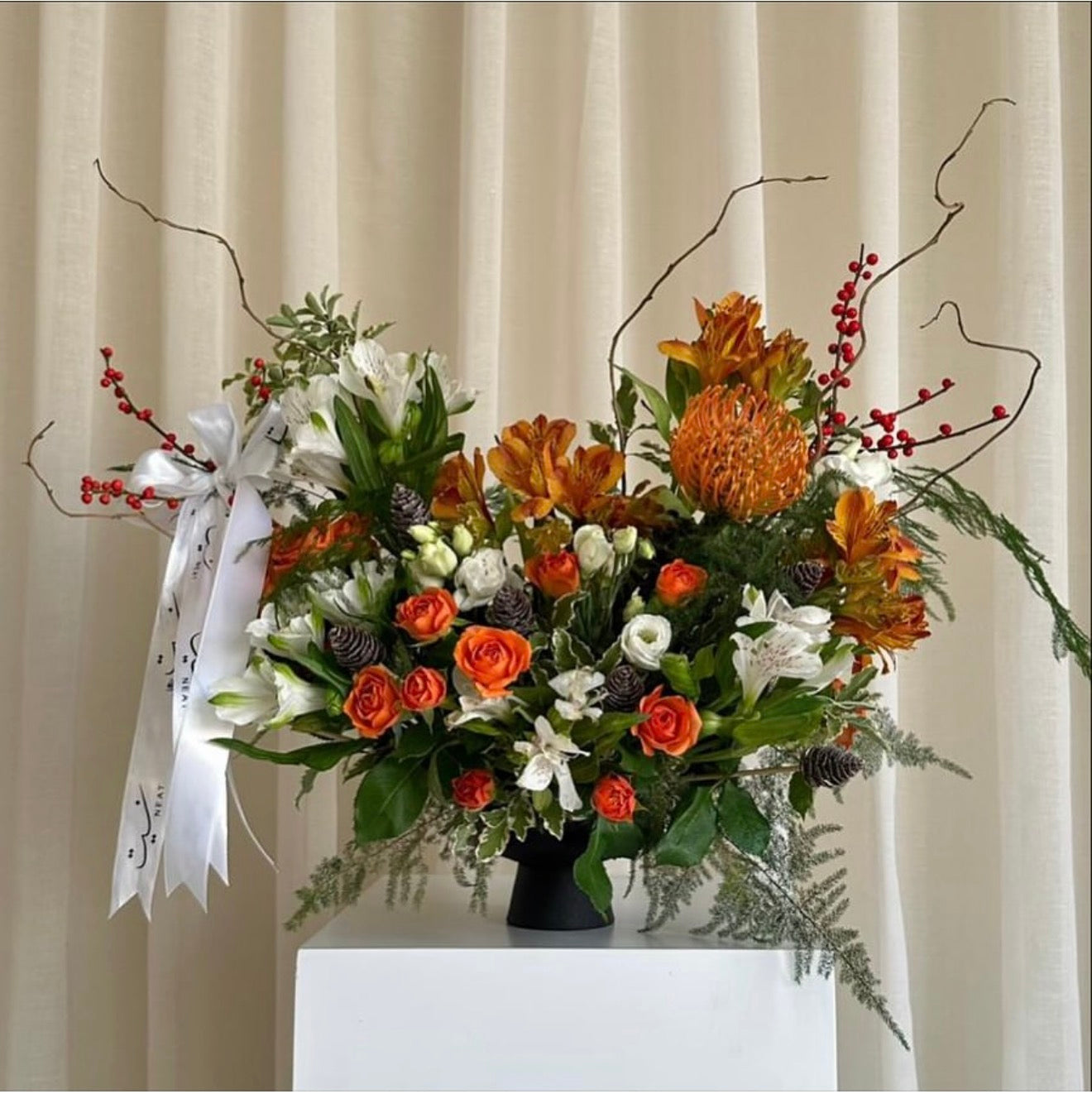 A vibrant ode to nature’s warmth — Autumn Muse captures the beauty of the season in every petal. Rich orange blooms blend harmoniously with creamy whites, deep greenery, and textured pinecones, accented by elegant red berries and sculptural branches. Arranged in a sleek black vase, this design embodies modern artistry and natural charm — perfect for gifting or elevating any refined space.