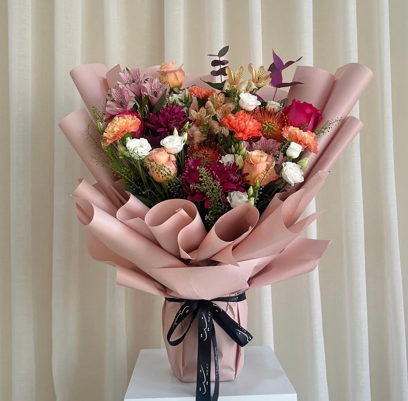 A soft symphony of color and emotion — Blush Harmony brings together peach roses, deep magenta blooms, and delicate white accents for a bouquet that radiates warmth and elegance. Wrapped in luxurious blush paper and tied with a chic black satin ribbon, it captures the beauty of balance — vibrant yet gentle, bold yet graceful. The perfect bouquet for celebrating love, friendship, or new beginnings.