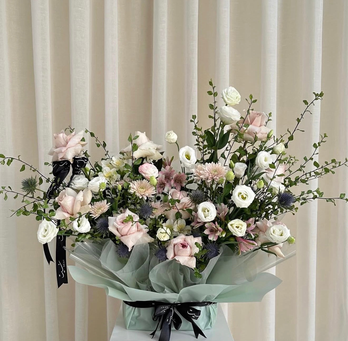 Blushing Petal is a graceful composition of soft elegance and delicate charm. Featuring blush roses, creamy lisianthus, pastel chrysanthemums, and touches of cool thistle, this bouquet creates a serene and romantic visual harmony. Its airy shape and fresh greenery add a natural flow, while the muted mint wrapping and black ribbon elevate the arrangement with a refined modern touch. Perfect for heartfelt gifting, celebrations, or adding a gentle glow to any space.