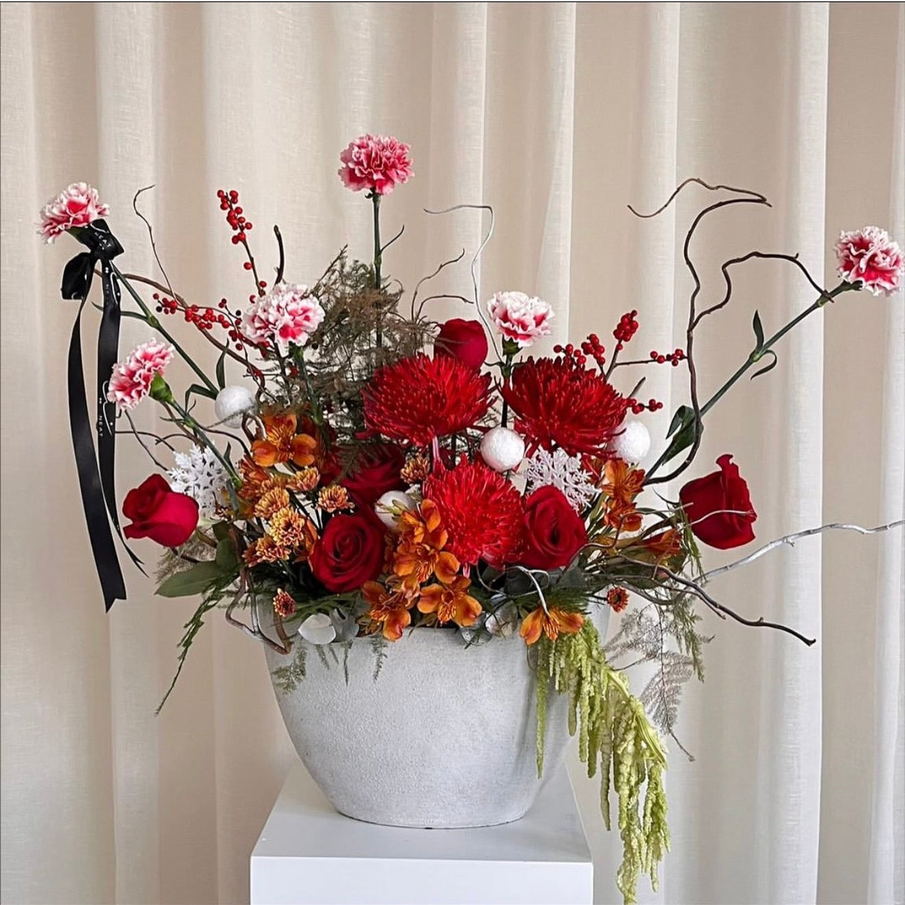 Bold, passionate, and full of life — Crimson Flame is a statement of strength and emotion. This arrangement combines deep red roses, fiery orange blooms, and playful pink accents, intertwined with artistic branches and winter textures. Set in a refined stone vase and finished with a black satin ribbon, it evokes warmth, confidence, and timeless allure — perfect for grand gestures and elegant spaces.