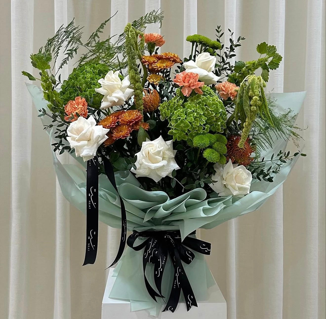 “Emerald Dawn” is a refreshing and vibrant bouquet designed to brighten any moment with natural elegance. Featuring lush green hydrangeas, crisp white roses, and warm citrus-toned blooms, this arrangement brings together harmony, freshness, and a touch of artistic flair. Wrapped in soft mint-green paper and finished with a luxurious black ribbon, it creates a striking balance between warmth and sophistication — perfect for celebrations, heartfelt gifts, or uplifting any space.