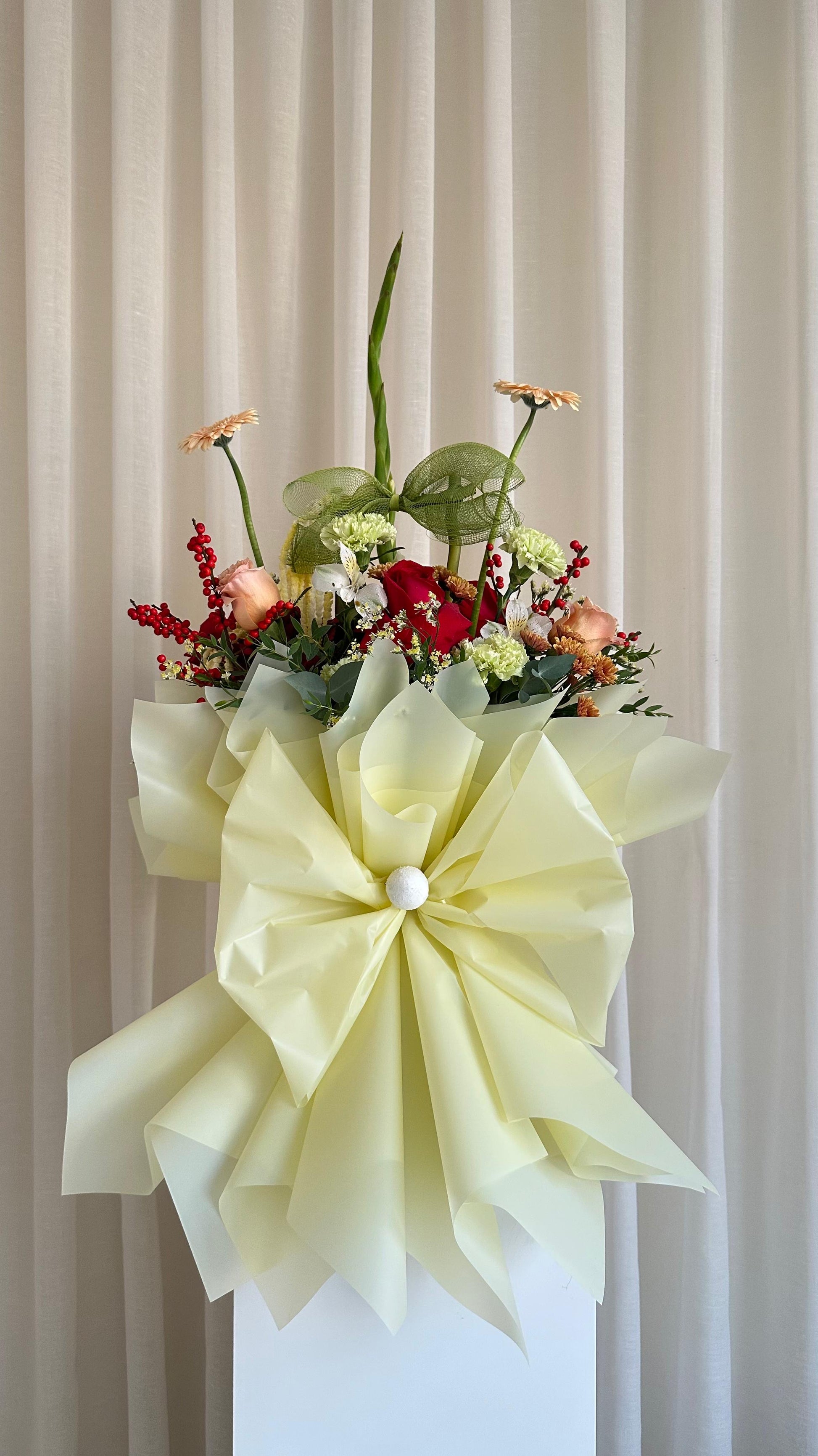 Bright, refreshing, and full of joy — Lemon Glow brings a burst of sunshine to any space. Featuring vibrant red roses, soft peach blooms, lively green accents, and delicate white florals, this bouquet shines with cheerful elegance. Wrapped in a uniquely styled lemon-yellow bow, it adds a playful yet sophisticated touch, making it the perfect gift for celebrations, gratitude, or lifting someone’s day with warmth and beauty.