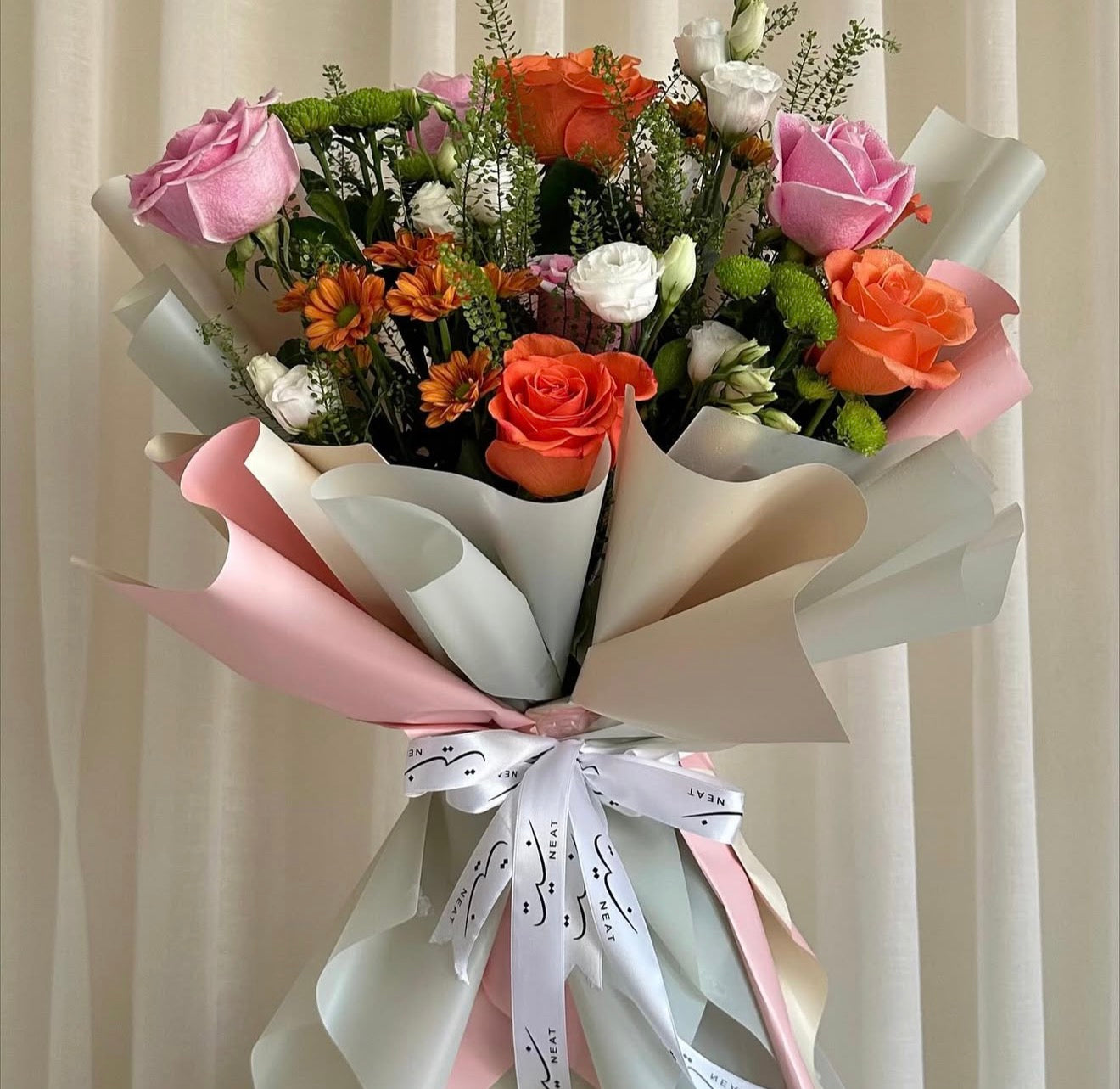 A joyful blend of charm and color — this bouquet captures the essence of happiness in full bloom. Bright orange and pink roses meet soft lilac tones and fresh greens, creating a perfect balance of warmth and grace. Wrapped in pastel layers and finished with a delicate ribbon, it’s a radiant choice for any occasion that deserves a touch of beauty and cheer.