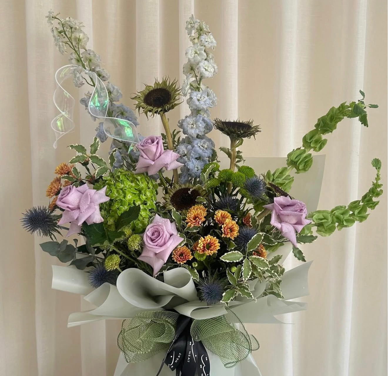 A bouquet where mystery meets elegance — Mystic Meadow is a captivating blend of soft lilac roses, deep blue thistles, and fresh green textures, accented by touches of amber and ivory. The composition evokes the feeling of a serene, enchanted garden — wild yet refined. Wrapped in sage-toned paper and finished with sleek ribbons, it’s the perfect arrangement for those who appreciate artful beauty and modern sophistication.