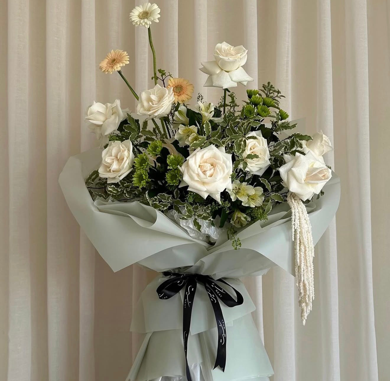 An expression of calm sophistication — Pure Serenity embodies timeless beauty through soft ivory tones and gentle textures. Featuring elegant white roses, delicate gerberas, and fresh greenery, this bouquet radiates purity and balance. Wrapped in layers of muted mint and finished with a sleek black ribbon, it’s a symbol of grace and peaceful luxury, perfect for any meaningful occasion.