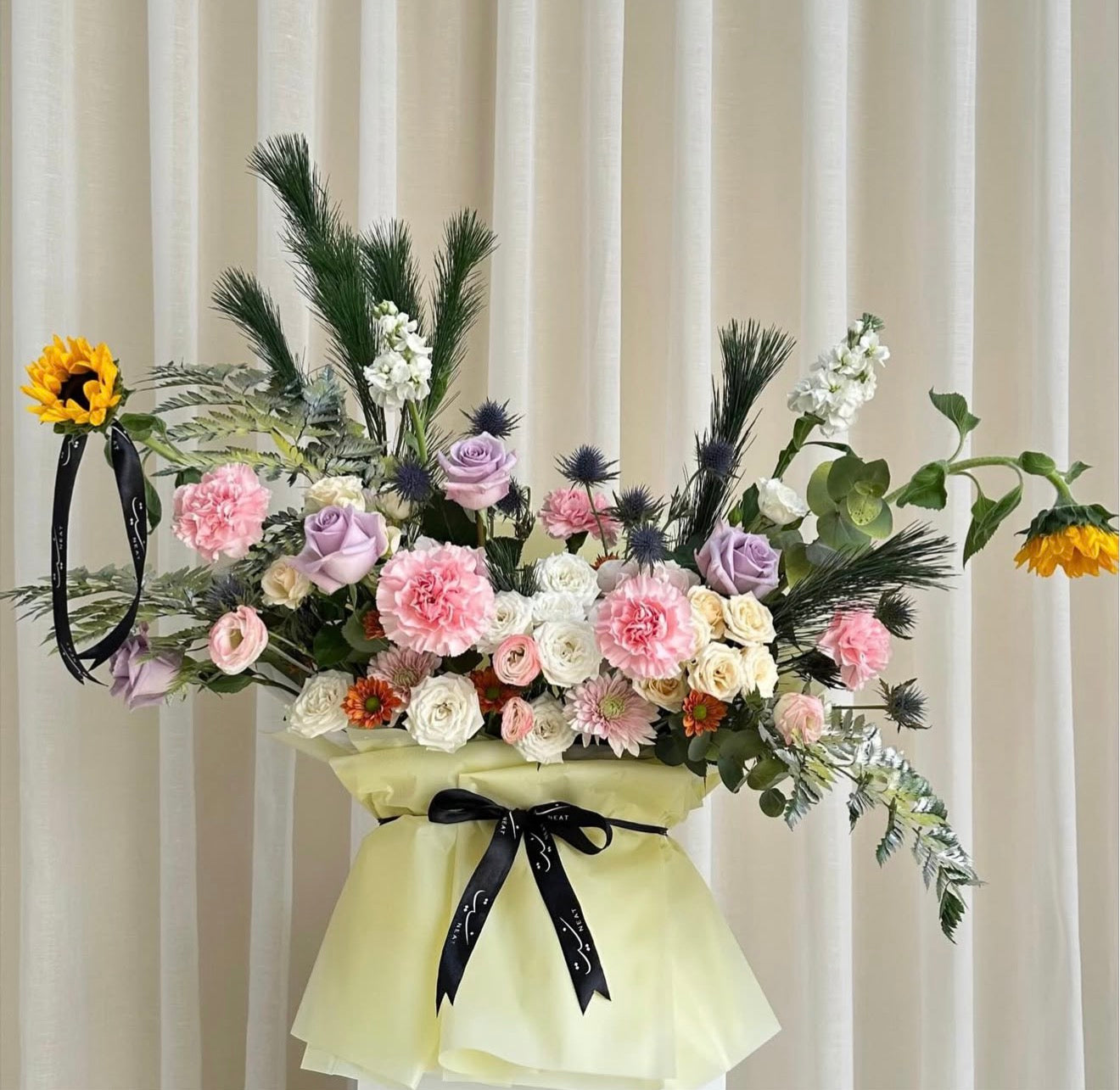Radiant Blossom is a joyful celebration of color, texture, and elegance. This artistic arrangement features soft pink carnations, lavender roses, creamy blooms, and playful sunflowers, all balanced with striking greenery and bold thistle accents. The combination creates a vibrant yet refined look—perfect for gifting, décor, or elevating any moment with a touch of radiant beauty. Wrapped in delicate yellow tones and finished with a sleek black ribbon, this bouquet embodies cheerful sophistication in every detail.