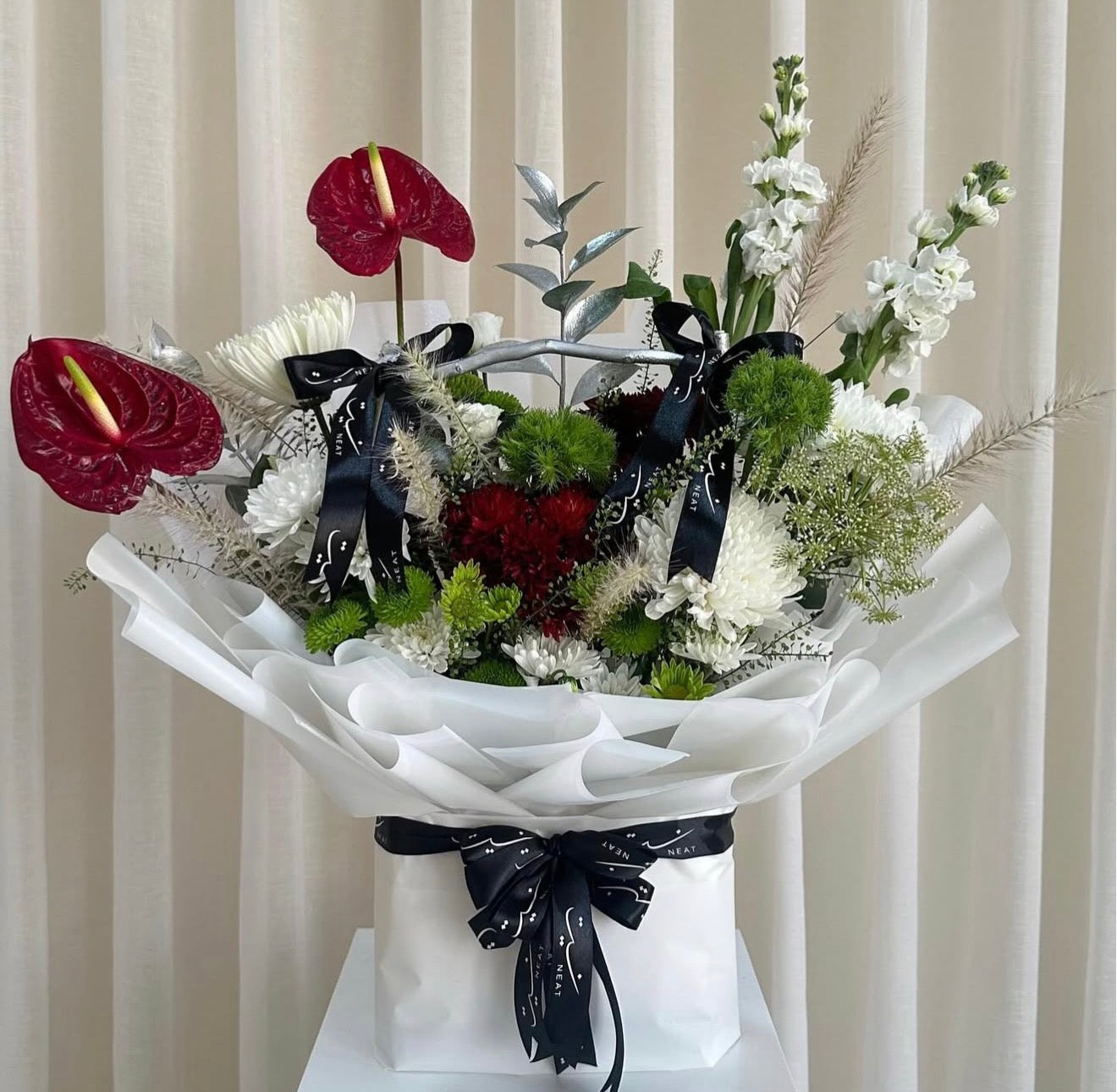 Red Frost is a bold and sophisticated arrangement designed to make a lasting impression. Deep red anthuriums rise gracefully among crisp white blooms, fresh green accents, and airy seasonal textures, creating a striking contrast that feels modern and luxurious. Wrapped in sculpted white layers and finished with a sleek black ribbon, this bouquet brings together elegance, drama, and timeless beauty.