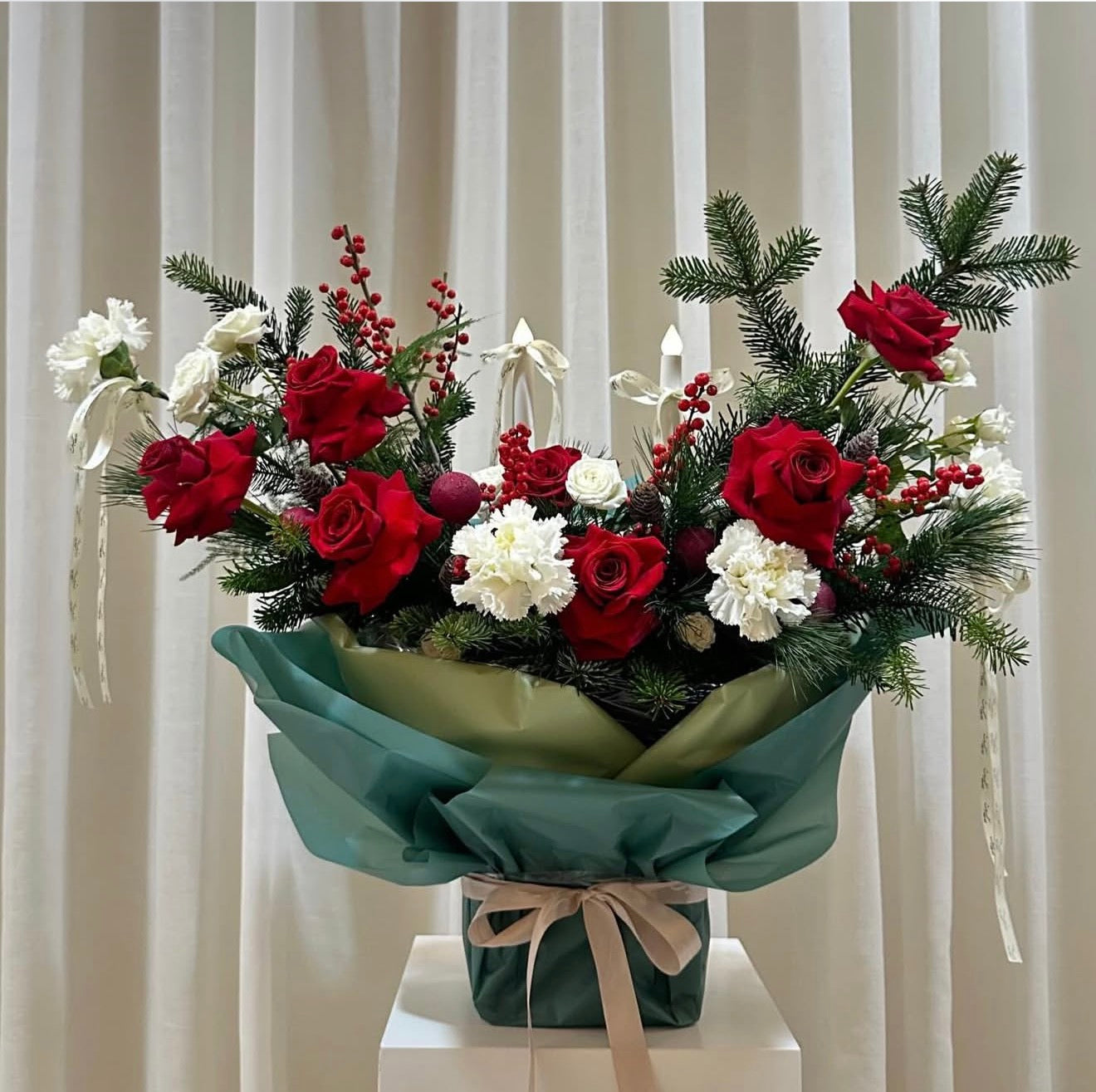 Introducing Ruby Grace, a striking bouquet that blends deep red roses, snow-white blooms, and festive winter greenery into a masterpiece of elegance. Accented with rich berries and wrapped in luxurious green tones, this arrangement radiates warmth, sophistication, and timeless charm. Perfect for holiday gifting, heartfelt moments, or adding a graceful touch of winter beauty to any space.