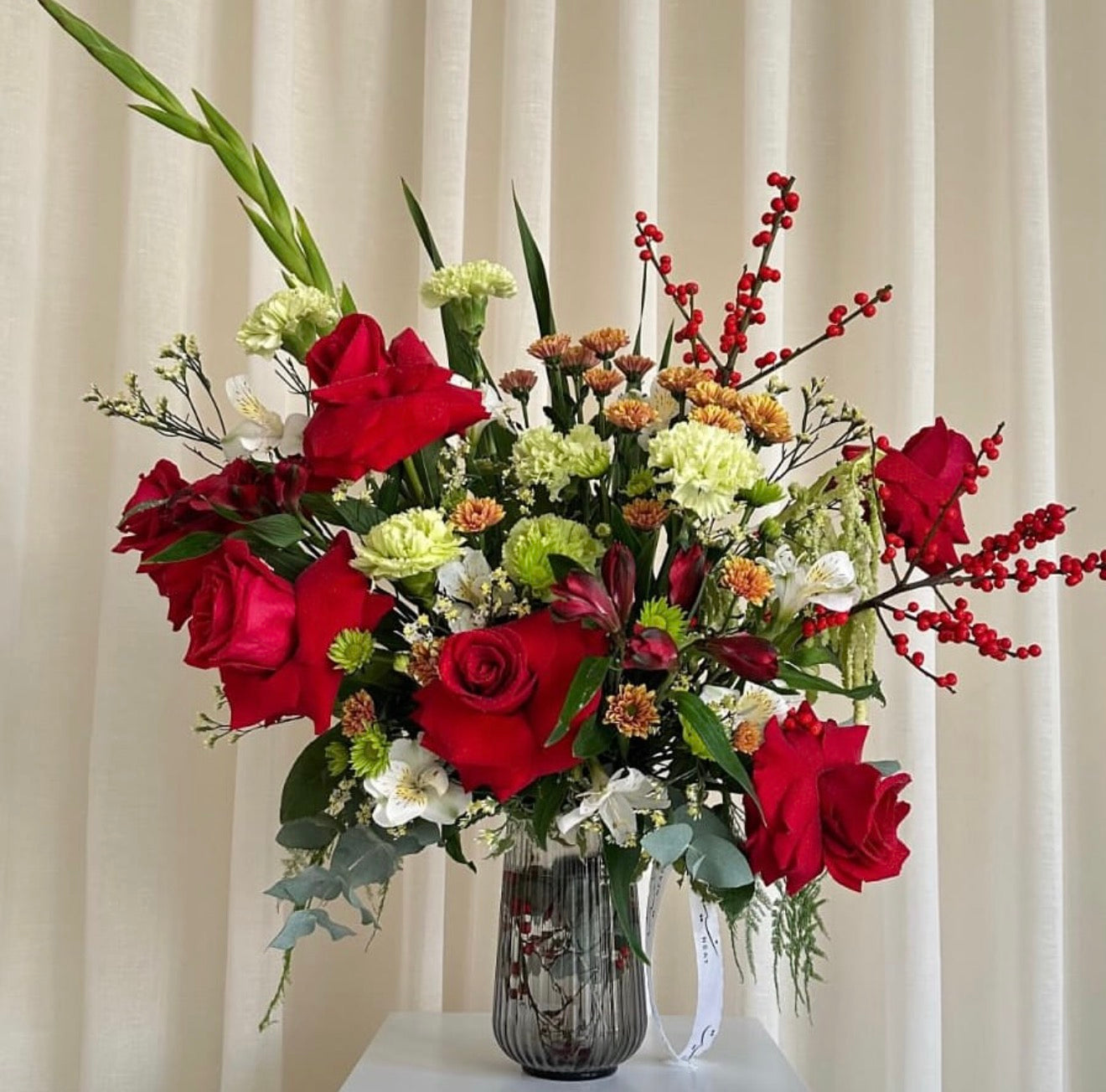 أنيقة ومفعمة بالجمال، همسة القرمز تنطق بلغة الشغف والرقي. تمتزج الورود الحمراء العميقة مع الزهور البيضاء والخضراء الناعمة لتشكّل باقة تجمع بين الجرأة والرومانسية. تأتي في مزهرية زجاجية أنيقة لتعبّر عن الجمال الخالد والمشاعر الراقية.
